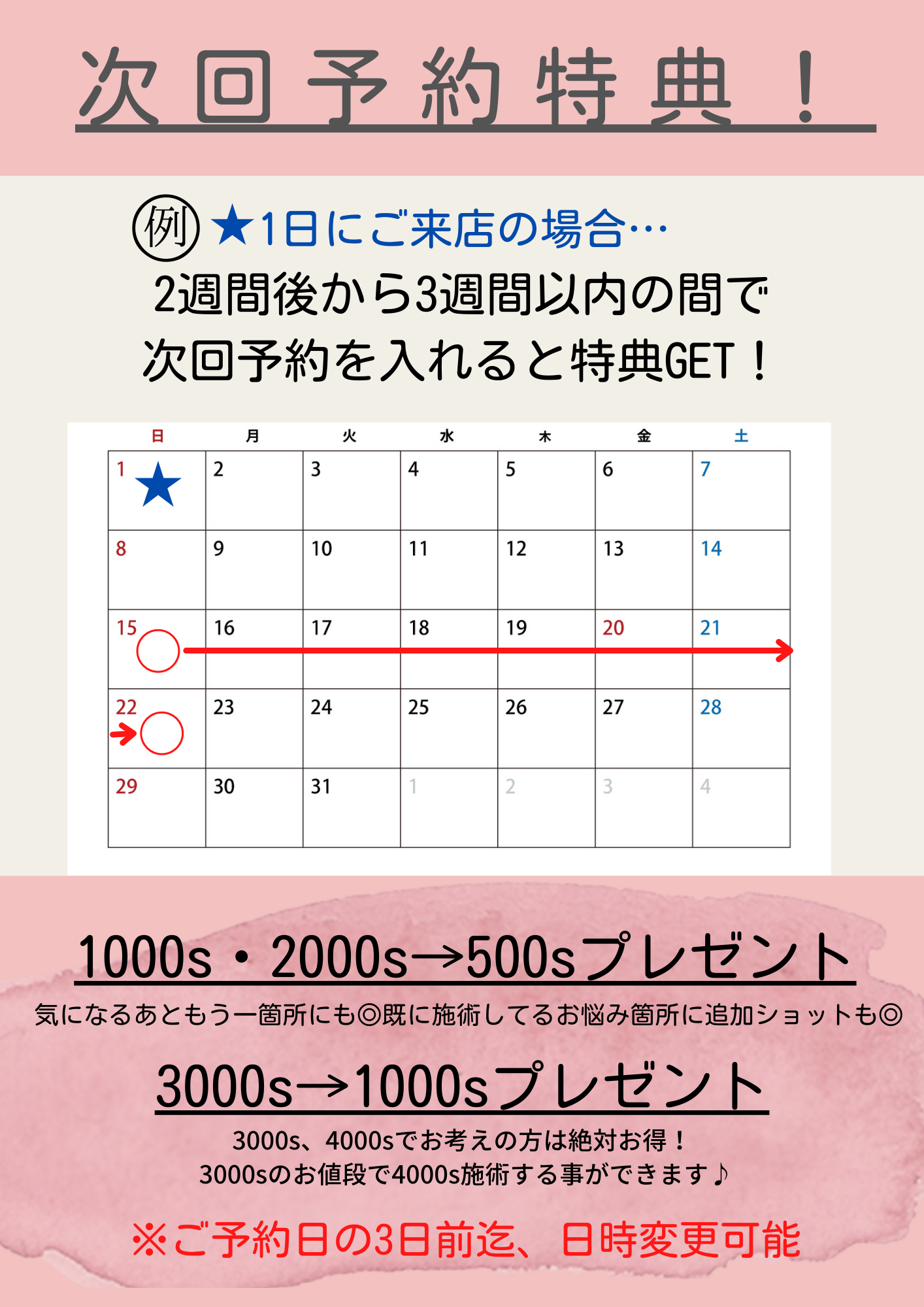 毎月定期的に通えるかは分からないけど、2週間後の予定なら、、そんな方はこちらの次回予約特典をご検討ください!